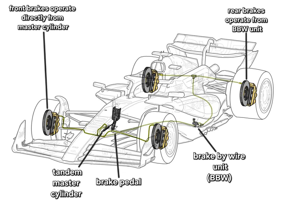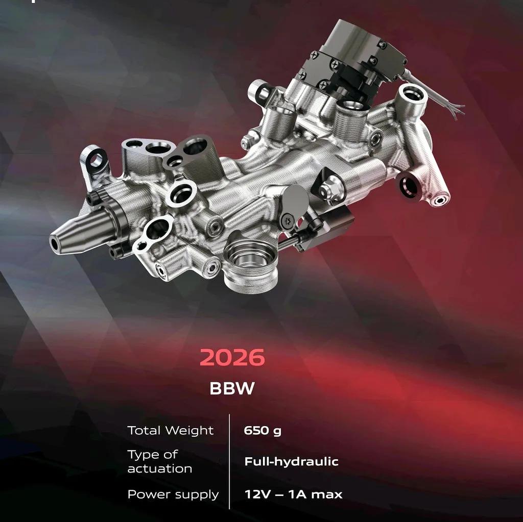 The design of this component of the Formula 1 brake-by-wire (BBW) system, manufactured by Brembo, is free, meaning teams can develop their own solutions. The rear braking system combines the disc brakes with the MGU-K energy harvesting system. The driver’s pedal input is measured by the ECU (Electronic Control Unit), which then regulates the balance between MGU-K regeneration and the required disc braking force via the BBW system.