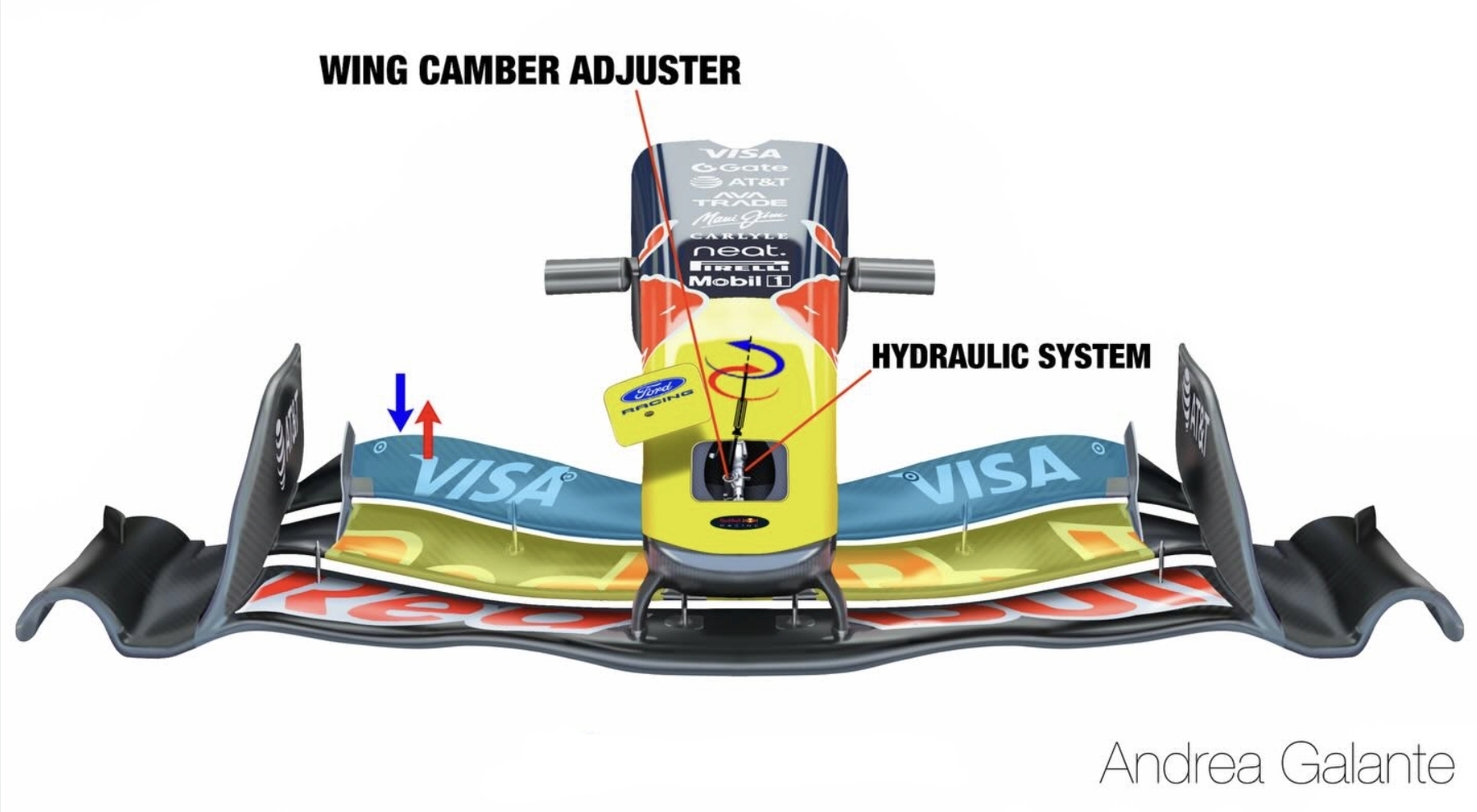 In Verstappen’s qualifying crash, the front nose was damaged, exposing the hydraulic system designed for active aerodynamics. The side slot, which allows the actuator to adjust the winglets’ attack angle (via a key mechanism), is clearly visible.