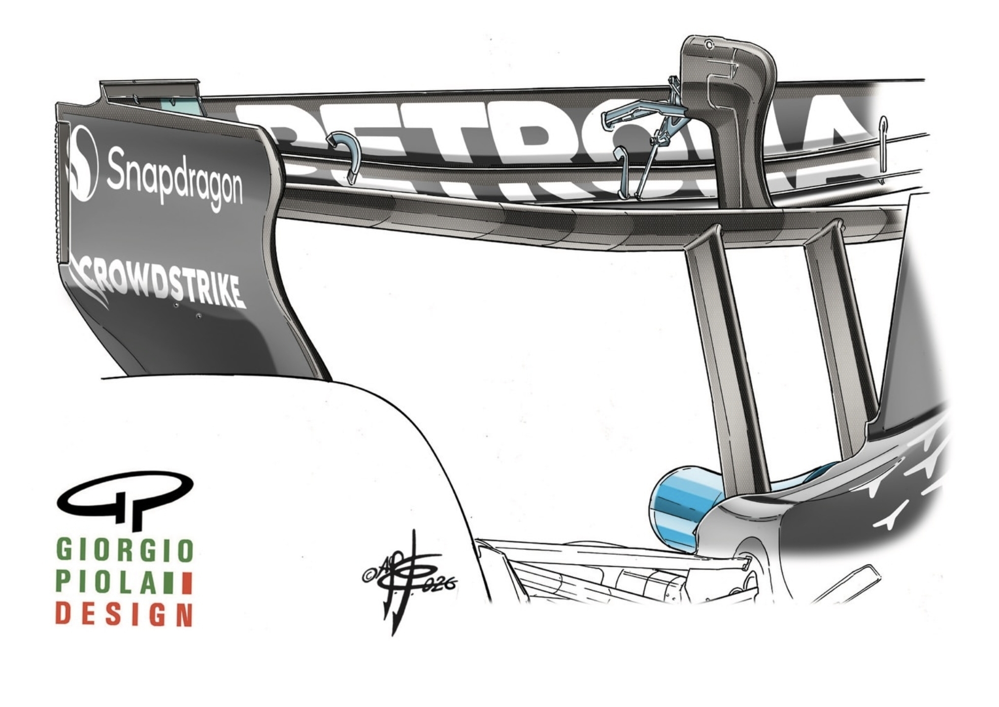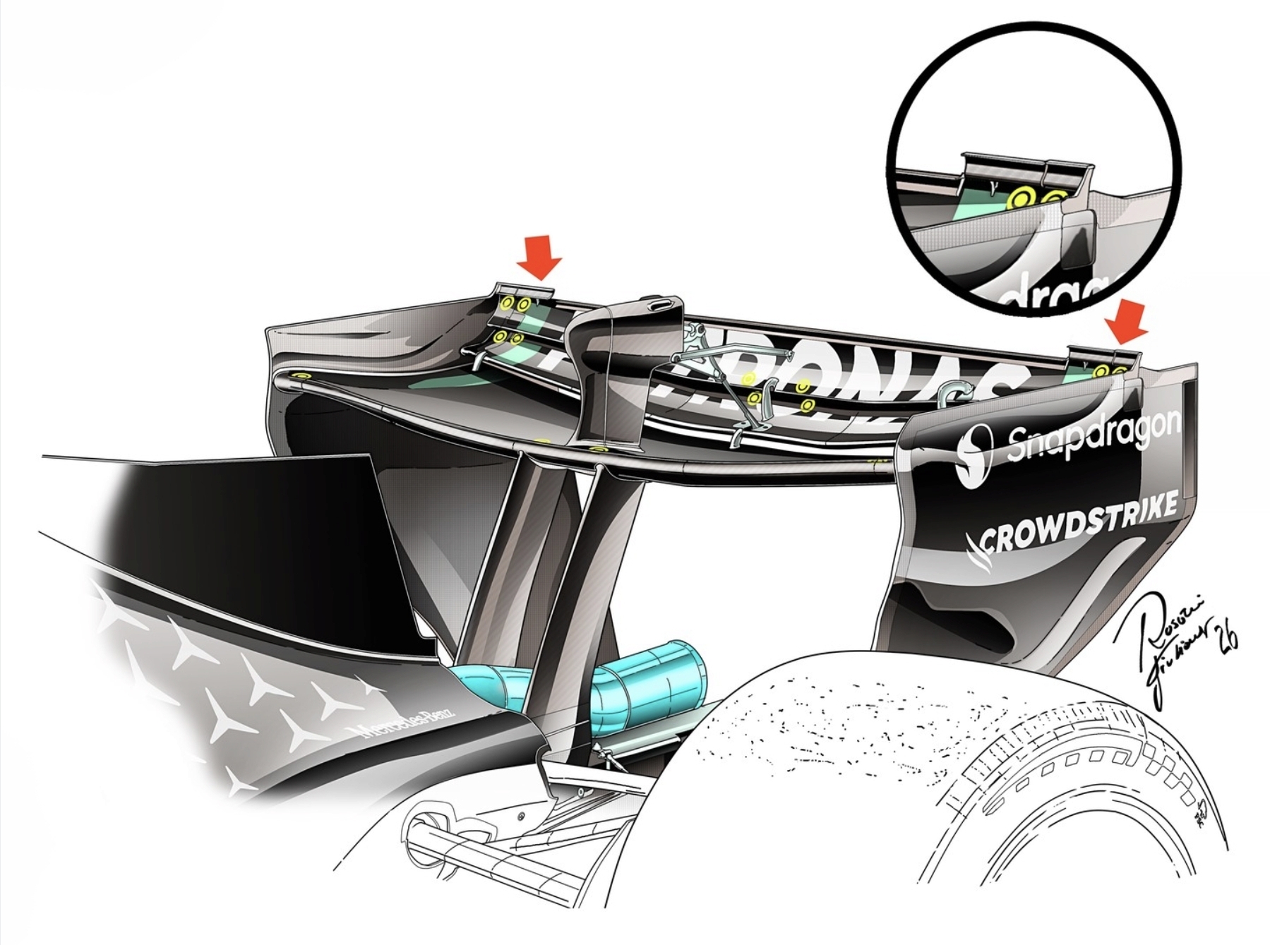 Mercedes dominated the opening race of the 2026 season. The W17’s engine, aerodynamics, and chassis make it strong, despite ongoing talks about the rules and the Mercedes power unit. Mercedes engineers have developed a truly fascinating rear wing, carefully interpreting the limits allowed by the technical regulations: the extensions on the sides of the final flap increase local downforce.