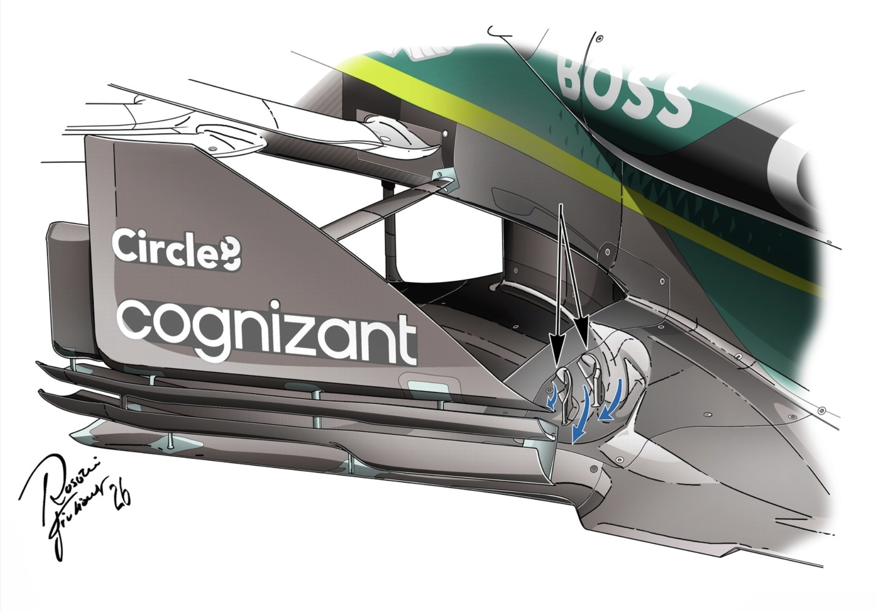 Aerodynamically, Aston Martin is undoubtedly the most interesting car to analyze, and it is truly disappointing that it suffers from serious mechanical issues. In Australia, another intriguing solution appeared at the front section of the floor, featuring two flow directors designed to create an outwash effect (directing airflow outward).
