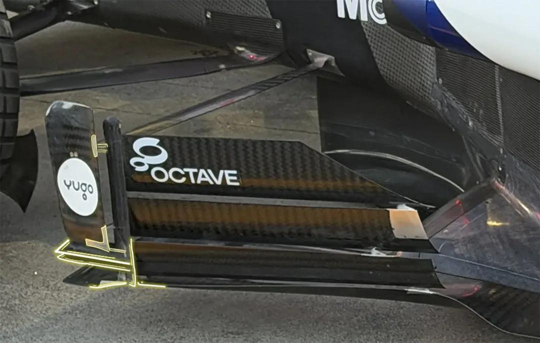 For the Australian Grand Prix, the Racing Bulls team has upgraded the edges of the car’s floor (floor footplate). The length of the first vertical element has been reduced to make room at the lower section for two small winglets. As a result, the position of the metal supports has also changed. Previously mounted on the horizontal main plane, these supports are now attached to the second vertical element. Modifications have also been made to the second vertical element, whose length has been increased to reach the level where it now intersects with the horizontal main plane.