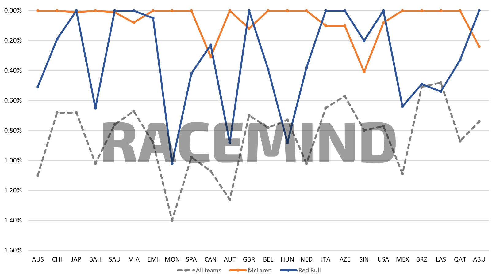 Rather than presenting the results of all teams individually, we have created a chart showing the relative performance of McLaren and Red Bull in each race. The chart also includes the average performance level of all ten teams alongside the two rivals.